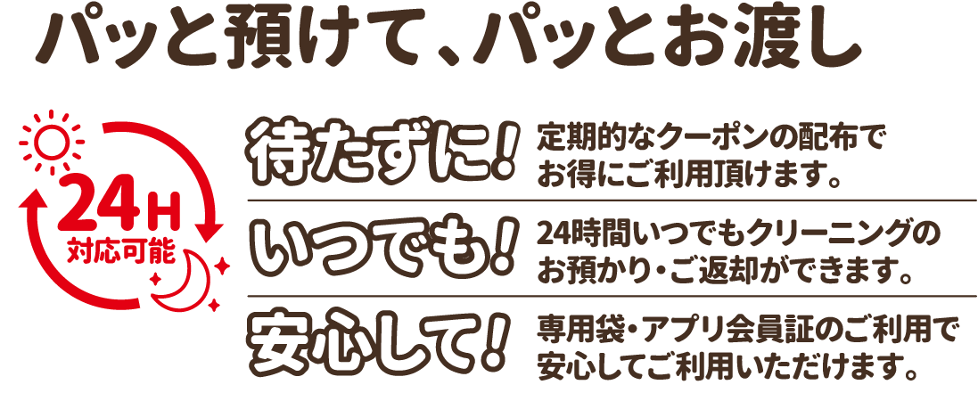 専用バックを利用してクリーニング品の24時間ロボットでお預かり・お渡しできるサービスです。