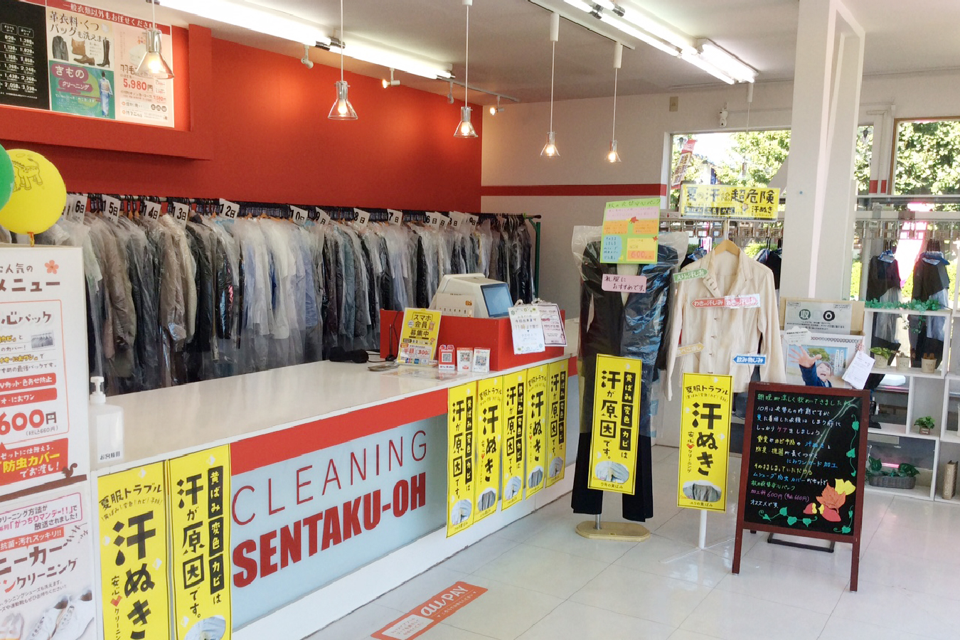 当店は、御所ケ丘小学校の近く、常総ふれあい道路沿いにあるクリーニング店です。